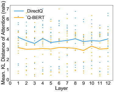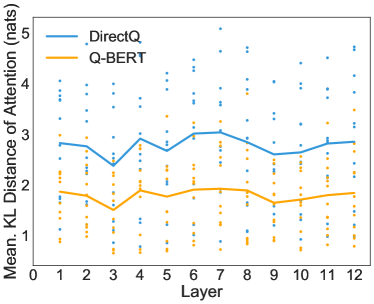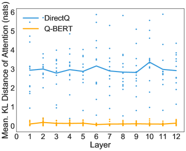 그림 5: Q-BERT/DirectQ와 Baseline 간의 주의 분포에 대한 KL 발산. Q-BERT와 Baseline 간의 거리는 DirectQ와 Baseline 간의 거리보다 훨씬 작습니다.