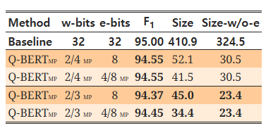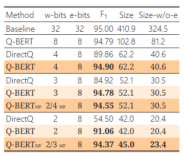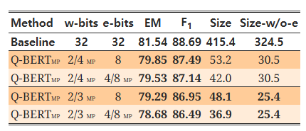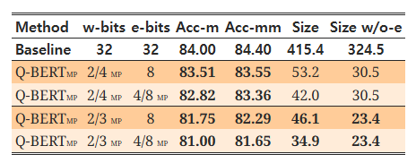 표 5: Q-BERT의 네 가지 작업에 대한 임베딩 혼합 정밀도 양자화 결과. 각 인코더 레이어와 임베딩 레이어에서 128개의 그룹을 사용하여 결과를 얻었습니다. 가중치에 사용된 양자화 비트는 "w-bits", 임베딩은 "e-bits", 모델 크기(MB 단위)는 "Size", 임베딩 레이어를 제외한 모델 크기(MB 단위)는 "Size-w/o-e"로 나타냈습니다. 단순성과 효율성을 위해 기준 모델을 제외한 모든 모델은 8비트 활성화를 사용했습니다. 여기서 "MP"는 혼합 정밀도 양자화를 의미합니다. 혼합 정밀도 임베딩은 4비트 단어 임베딩과 8비트 위치 임베딩을 사용했습니다.