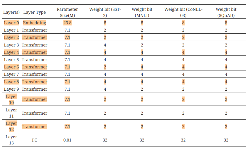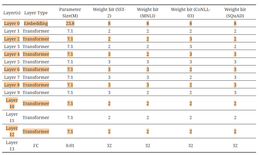 각 인코더 레이어는 서로 다른 구조에 주의를 기울이며 [5], 따라서 각 레이어는 서로 다른 민감도를 보입니다. 모든 레이어에 동일한 비트 수를 할당하는 것은 최적이 아닙니다. 목표 모델 크기가 매우 작고, 4비트 또는 2비트와 같은 초저정밀도가 요구될 경우 이 문제는 더욱 중요해집니다. 따라서 성능을 유지하기 위해 민감한 레이어에 더 많은 비트를 할당하는 혼합 정밀도 양자화를 탐구합니다.