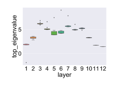 그림 2: (a)에서 (d)까지는 SST-2, MNLI, CoNNL-03, SQuAD에 대해 각각 다양한 인코더 레이어에서의 상위 고유값 분포를 보여줍니다. 각 작업에서 데이터의 10%를 사용하여 상위 고유값을 계산하고, 10번의 개별 실행을 통해 상위 고유값 분포를 그렸습니다. 중간 레이어는 평균 값이 더 높고 다른 레이어보다 분산이 큰 경향을 보입니다. 마지막 세 개의 레이어는 모든 레이어 중에서 가장 낮은 분산과 평균 값을 가지고 있습니다.