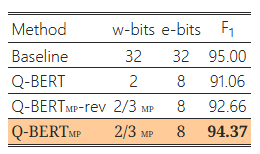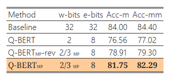 표 6: 모든 네 가지 작업에서 2/3비트 Q-BERTMP에 대한 비트 설정.