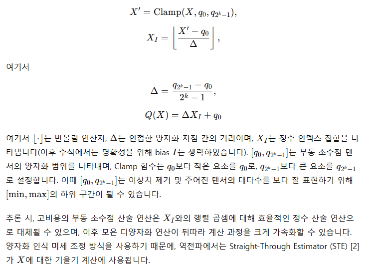 순방향 전파에서, 가중치 또는 활성화 텐서 X의 각 요소는 다음과 같이 양자화됩니다: