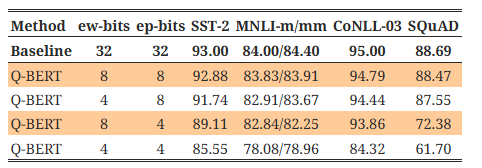 표 2: Q-BERT의 세 가지 작업에서의 그룹별 양자화 효과