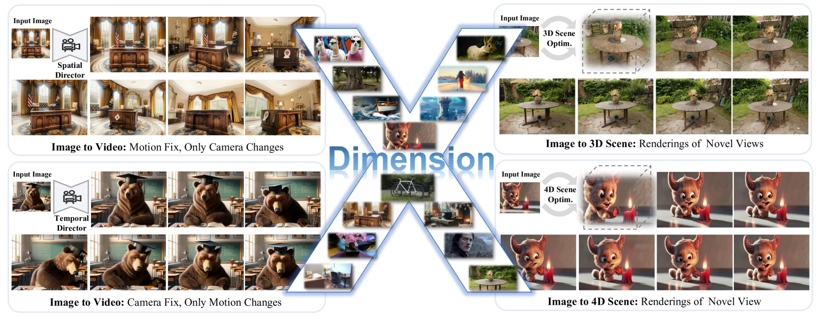 그림 1: 단 하나의 이미지를 입력으로 하여, 제안된 DimensionX는 공간적 및 시간적 차원을 인식하여 매우 현실적인 비디오 및 3D/4D 환경을 생성할 수 있습니다.