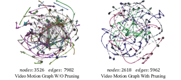 GVR에서 얻어진 초기 모션 그래프는 연결성이 제한적이며, 이는 그림 4에 나타난 바와 같이 긴 경로를 샘플링하는 효율을 저하시킵니다. 빔 탐색(Beam search) 및 동적 프로그래밍과 같은 탐색 알고리즘은 보통 모션 그래프에서 출력 엣지가 없는 노드, 즉 '죽은 끝점'에 도달하게 됩니다. 특히 샘플 경로가 죽은 끝점에 도달할 확률은 샘플 길이에 따라 증가하며, 10초 비디오를 무작위로 샘플링할 때는 75.9%, 30초 비디오에서는 98.6%에 달합니다. 이 문제를 해결하기 위해 우리는 강한 연결 성분(SCC) 하위 그래프들을 병합하는 그래프 가지치기 방법을 도입합니다. 강한 연결 성분은 각 노드가 하위 그래프 내에서 다른 모든 노드에 도달 가능한 최대 하위 그래프를 의미합니다. 구체적으로, 우리는 알고리즘 1을 사용하여 그래프 내 어느 지점에서든 시작해 원하는 길이의 비디오를 샘플링할 수 있는 강한 연결 성분을 얻습니다.