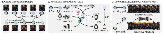 그림 3: TANGO의 시스템 파이프라인. TANGO는 세 단계로 제스처 비디오를 생성합니다. 첫째, 디렉션 모션 그래프를 생성하여 비디오 프레임을 노드로 나타내고 유효한 전환을 엣지로 나타냅니다. 각 샘플 경로(굵은 선)는 선택된 재생 순서를 결정합니다. 둘째, 오디오 조건 제스처 검색 모듈이 교차 모달 특징 거리를 최소화하여 제스처가 목표 오디오와 가장 잘 맞는 경로를 찾도록 합니다. 마지막으로, 확산 기반 보간 모델이 원본 참조 비디오에 전환 엣지가 존재하지 않을 때 외형 일관성이 있는 연결 프레임을 생성합니다.