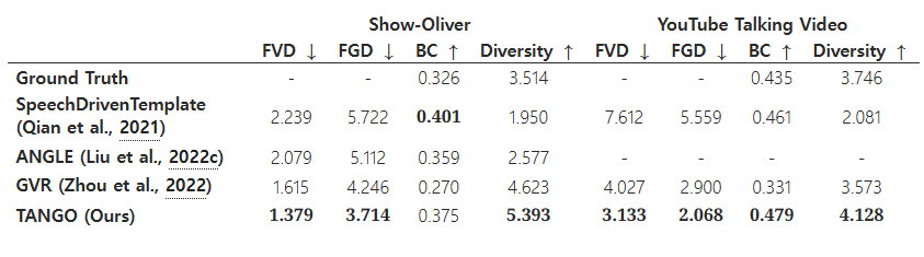 - FVD와 FGD는 계산되지 않으며, BC와 Diversity는 각각 0.326, 3.514(Show-Oliver), 0.435, 3.746(YouTube Talking Video)입니다. 이는 우리가 생성하고자 하는 목표 수준을 나타냅니다.