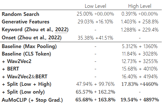 이 표에서 TANGO의 최종적인 AuMoCLIP은 저수준과 고수준 검색에서 모두 우수한 성능을 보여줍니다. 특히 Stop Gradient 접근 방식을 통해 저수준 인코더와 고수준 인코더의 최적화 간섭을 방지하여 각 특징의 성능을 극대화할 수 있었습니다. 이를 통해 기존의 모든 접근 방식보다 훨씬 나은 오디오-모션 검색 성능을 달성할 수 있었습니다.