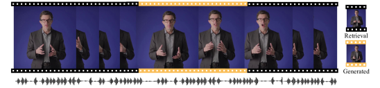 음성으로부터 제스처가 동기화된 비디오를 생성하는 것은 유망하지만, 사람들은 비디오의 텍스처 품질뿐 아니라 제스처와 음성의 음향 및 의미적 특성 간의 관계에 매우 민감하기 때문에 많은 도전이 있습니다. 기존 방법들은 대체로 생성(generative)과 검색(retrieval) 두 가지 그룹으로 분류될 수 있습니다. 생성 방식(Ginosar et al., 2019; Qian et al., 2021)은 주어진 오디오나 오디오에서 추정한 2D 포즈로부터 모든 프레임을 비디오 생성 신경망을 통해 생성합니다(Chan et al., 2019). 반면 검색 방식(Zhou et al., 2022)은 기존 프레임들을 재조합하여 오디오와 맞추고 재조합 경계를 위한 몇 개의 전이 프레임을 생성합니다. 생성 방식은 종종 손이나 옷 텍스처에서 시간적 블러와 같은 아티팩트가 발생하는 문제가 있습니다. 이러한 한계 때문에 현실 세계에서 더 높은 비디오 품질을 보장하는 검색 방식을 선택했습니다