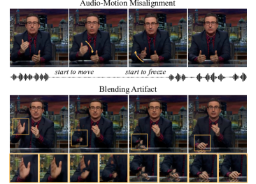 생성 기반 접근(Qian et al., 2021; Liu et al., 2022a; Yoon et al., 2020; Liu et al., 2022b; Yang et al., 2023a; b; Zhu et al., 2023; Yi et al., 2023; Pang et al., 2023; Nyatsanga et al., 2023; He et al., 2024b)은 주어진 오디오에서 두 단계 파이프라인을 통해 모든 프레임을 생성합니다. 예를 들어 speech2gesture 및 음성 기반 템플릿(Ginosar et al., 2019; Qian et al., 2021) 등의 방법들은 처음에 오디오를 특화된 네트워크를 통해 포즈로 매핑하고, 이후 별도의 GAN 기반 pose2video 사전 학습 모델(Chan et al., 2019)을 사용해 이러한 포즈를 비디오 프레임으로 변환합니다. 최근 연구들은 확산 모델을 사용하여 pose2video의 성능을 개선했습니다. 예를 들어 AnimateAnyone(Hu et al., 2023)은 참조 네트(attention-based) 모션 모듈(Guo et al., 2023)을 활용하여 공간적 및 시간적 일관성을 유지합니다. 전반적으로, 생성 방법으로부터의 골격 수준 결과는 대개 오디오와 일치하지만, pose2video 단계(Chan et al., 2019; Zhang et al., 2023b; Hu et al., 2023; Rombach et al., 2022)가 병목 현상으로 손과 옷 텍스처에서 시간적 블러 같은 아티팩트가 자주 발생합니다. 이는 네트워크가 높은 해상도, 장기적 시간 일관성, 다양한 신체 변형을 처리해야 하기 때문입니다. 이러한 한계는 기존 비디오 프레임을 재사용하는 우리의 접근이 가진 이점을 보여줍니다. 우리의 방법에서는 pose2video가 시작 및 끝 프레임이 있는 짧은 클립에서만 필요하기 때문에, 최소한의 아티팩트로 높은 품질의 결과를 유지할 수 있습니다.