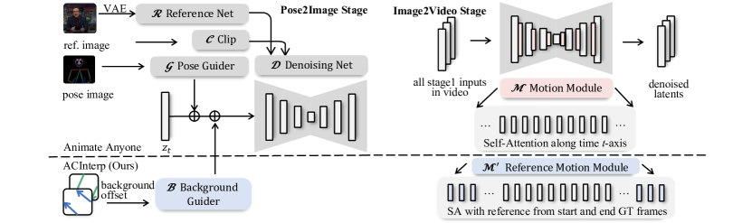 그림 6에서 보이듯이, Pose2Image 단계는 무작위 노이즈 z_t를 샘플링하고 이를 추정된 이미지 잠재 변수 z^0로 디노이즈하는 것을 목표로 합니다. AnimateAnyone(Hu et al., 2023)과 마찬가지로, ACInterp는 다음을 수행합니다: