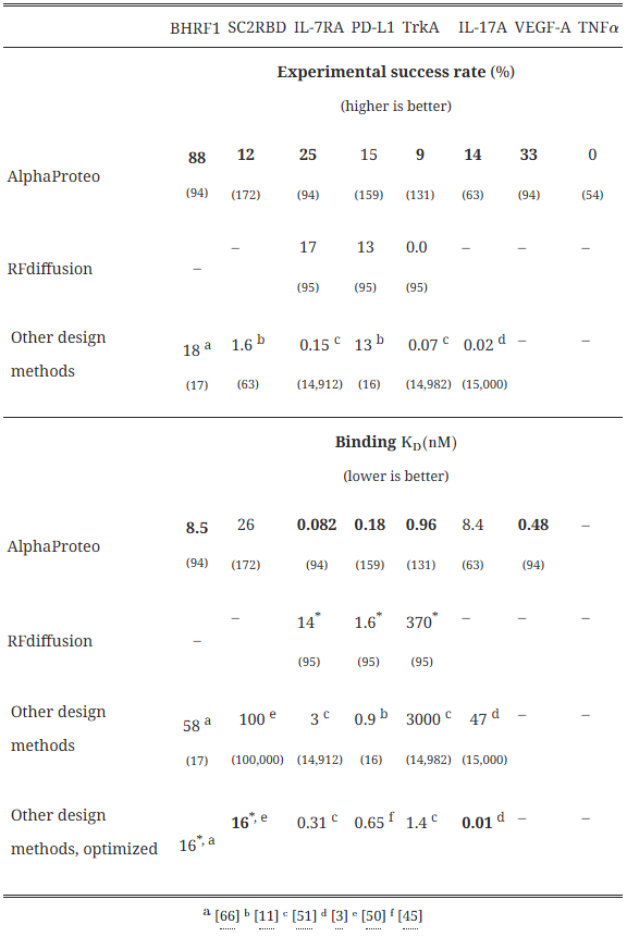 - AlphaProteo, RFdiffusion, 그리고 기타 설계 방법들에 대해 각 표적에 대해 결과가 제공됩니다. 괄호 안의 숫자는 테스트된 설계의 수를 나타냅니다.