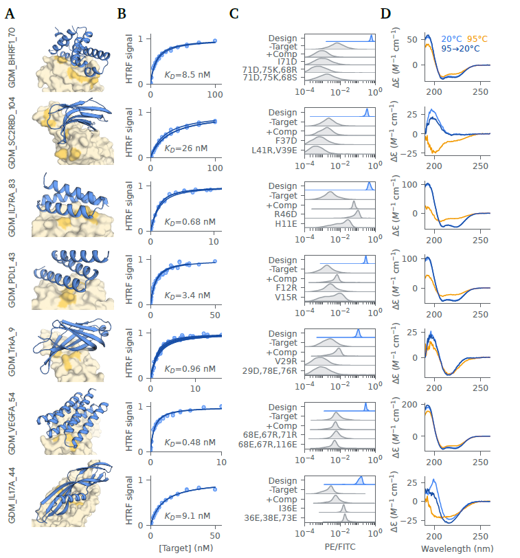 높은 실험적 성공률은 결합체를 얻는 데 필요한 노동과 비용을 줄일 수 있지만, 히트를 발견한 후 더 중요한 지표는 표적에 대한 **결합 친화도 (K_D)**입니다. 대부분의 치료용 항체는 실험적 친화도 성숙 과정을 여러 번 거쳐서 낮은 피코몰라(pM) 수준의 K_D 값을 가집니다 [15, 40]. 연구 도구로 사용되는 결합체의 경우에도 낮은 나노몰라(nM) 수준 혹은 그 이상의 K_D 값이 일반적입니다 [26]. 우리가 설계한 결합체들이 표적에 얼마나 강하게 결합하는지를 측정하기 위해, 우리는 효모 스크리닝 히트를 재조합으로 E. coli에서 발현 및 정제하고, 그들의 K_D 값을 in vitro에서 측정했습니다. 전체적으로, 후속 연구를 위해 선택된 설계의 93%가 E. coli에서 성공적으로 발현되었으며 (Table S3), 대다수는 크기 배제 크로마토그래피에서 단분산(mono-disperse) 특성을 보였습니다 (Figure S4). 원형 이색성 (CD) 분광법으로 분석된 설계의 일부는 모두 예상된 2차 구조를 보였습니다 (Figure 2, Figure S5). 또한, 이 설계들은 CD 열 용융 테스트에서 최대 95°C까지 부분적 또는 전혀 펼쳐지지 않는 모습을 보여, 열 안정성(T_m 값) > 95°C 이상으로 매우 높음을 나타냈습니다 (Figure S5). 재조합 생산된 설계에 대해, 우리는 균질 시간 분해 형광 (HTRF) 평형 포화 결합 분석을 사용해 K_D 값을 측정했습니다 (섹션 S1.4).