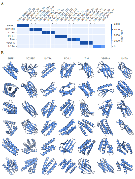 - 높은 성공률: 안정적이고 발현이 잘 되며 특정성을 가지는 결합체를 수십 개의 설계 후보 중에서 선별하여 얻을 수 있어 고처리량 방법의 필요성을 줄일 수 있습니다.