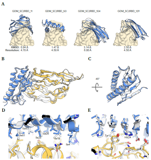 (A) SARS-CoV-2 스파이크 단백질(노란색)과 결합한 설계된 결합체(파란색)의 극저온 전자현미경(cryo-EM) 구조로, 스파이크 단백질에 AF2-multimer 예측(회색)과 정렬되었습니다. Cryo-EM 구조 해상도와 AF2-multimer와 실험적 구조 간의 표적에 정렬된 결합체 Cα RMSD 값이 표시되어 있습니다.