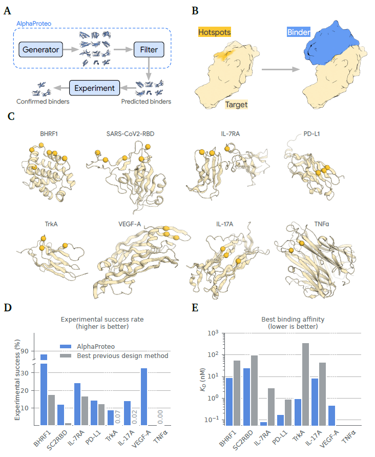 - 특히 IL-7RA, BHRF1, 그리고 VEGF-A와 같은 표적에 대해 AlphaProteo의 성능이 매우 뛰어납니다.