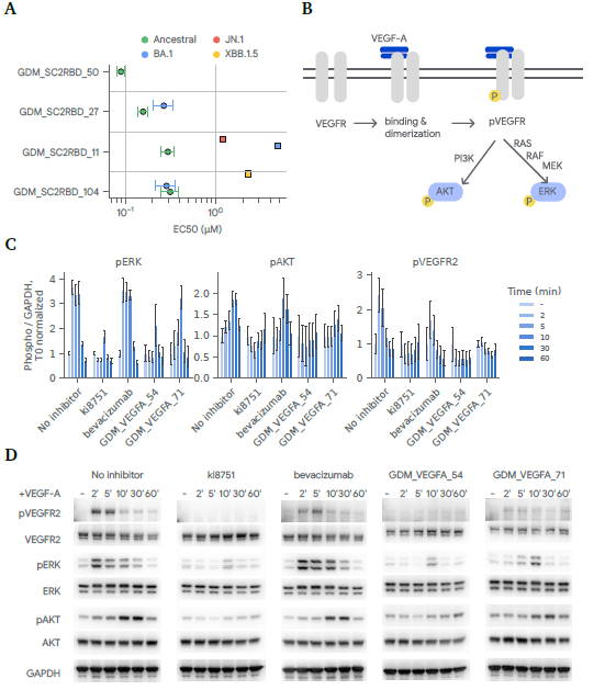 우리는 또한 설계된 결합체 GDM_VEGFA_54와 GDM_VEGFA_71이 VEGF 신호를 억제하는 능력을 테스트했습니다. 우리는 인간 VEGF-A로 자극된 1차 인간 제대정맥 내피세포(HUVECs)에서 **VEGF 수용체 2 (VEGFR2)**와 하위 ERK 및 AKT 키나제의 인산화를 측정했습니다 (그림 4). GDM_VEGFA_54와 함께 배양한 결과, ERK, AKT, 및 VEGFR2의 인산화가 VEGF-A만 있는 대조군("억제제 없음")과 비교해 상당히 감소했습니다 (그림 4). 이러한 효과는 강력한 소분자 VEGFR2 키나제 억제제인 ki8751 [25]의 효과와 유사합니다. 이 효과는 임상에서 승인된 약물 Avastin의 활성 성분인 항-VEGF-A 단클론 항체 베바시주맙의 효과보다 더 강력했으며, 이 실험에서 베바시주맙을 결합체와 동일한 몰 농도로 테스트했습니다. 이 농도는 HUVECs에서 in vitro로 보통 테스트되는 농도보다 1000배 낮은 농도이므로, GDM_VEGFA_54가 HUVECs에서 베바시주맙보다 더 강력한 VEGF-A 억제제임을 시사합니다. 두 번째로 테스트된 결합체 GDM_VEGFA_71은 ERK, AKT, 및 VEGFR2의 인산화가 감소하는 효과를 보였지만, 그 감소 효과는 GDM_VEGFA_54보다는 약했습니다. 이러한 결과는 VEGF-A에 대한 GDM_VEGFA_54와 GDM_VEGFA_71의 in vitro 결합 친화도가 각각 0.48 nM 및 4.7 nM임과 일치합니다.