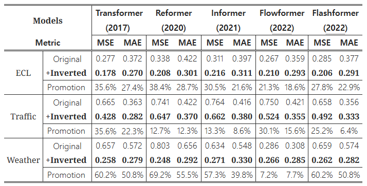 이 표에서는 Transformer 및 다양한 변형 모델들에 대해 원래 모델과 반전(iTransformer 적용) 버전의 성능을 비교하고, 그 성능 향상도를 %로 나타내고 있습니다. 주요 지표로는 MSE(평균 제곱 오차)와 MAE(평균 절대 오차)를 사용하며, 낮을수록 더 나은 성능을 의미합니다.