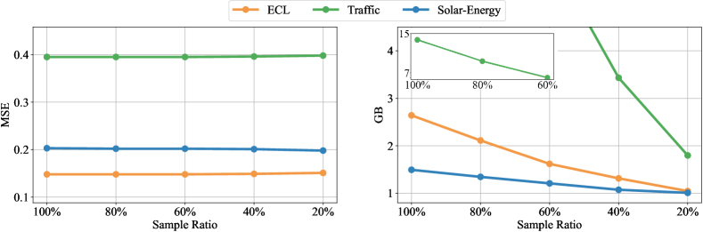 자기 주의의 이차 복잡성으로 인해, 많은 변수를 학습하는 것이 상당히 부담이 될 수 있으며, 이는 실제 시나리오에서 매우 흔합니다. 효율적인 주의 메커니즘 외에도, 우리는 이전에 입증된 변수 생성 능력을 활용하여 고차원 다변량 시계열에 대한 새로운 학습 전략을 제안합니다. 구체적으로, 각 배치에서 변수의 일부만을 무작위로 선택하고, 선택된 변수로만 모델을 학습합니다. 반전 덕분에 변수 채널의 수가 유연하기 때문에, 모델은 예측을 위해 모든 변수를 예측할 수 있습니다. 그림 8에 나타난 것처럼, 제안된 전략의 성능은 전체 변수 학습과 비교했을 때 여전히 유사하지만, 메모리 사용량은 크게 줄일 수 있습니다.