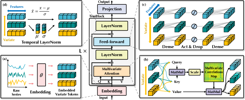 타임스탬프의 다변량 포인트를 하나의 시간 토큰으로 임베딩하는 잠재적 위험을 고려하여, 우리는 시계열을 반전시켜 각 변수를 독립적으로 전체 시계열을 (변수) 토큰으로 임베딩하는 방식을 채택했습니다. 이는 국소 수용 영역을 확장하는 Patching(Nie et al., 2023)의 극단적인 사례입니다. 반전함으로써, 임베딩된 토큰은 다변량 상관관계를 위해 부흥하는 주의 메커니즘에 의해 더 잘 활용될 수 있는, 보다 변수 중심적인 글로벌 표현을 집계합니다. 한편, 피드포워드 네트워크는 임의의 과거 시계열로부터 인코딩된 변수들에 대해 일반화 가능한 표현을 학습하고, 이를 통해 미래 시계열을 예측하는 데 충분한 능력을 발휘할 수 있습니다.