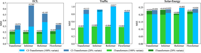 이 가설을 검증하기 위해, 우리는 다른 일반화 전략인 채널 독립성(Channel Independence)과의 비교를 수행했습니다. 이는 모든 변수를 예측하기 위해 공유된 백본을 훈련하는 방법입니다. 각 데이터셋의 변수를 다섯 개의 폴더로 나누고, 한 폴더의 변수 중 단 20%만을 사용하여 모델을 학습한 후, 모든 변수를 직접 예측하는 방식으로 실험을 진행했습니다. 성능 비교는 그림 5에 나와 있으며, 각 막대는 폴더의 랜덤성을 피하기 위해 모든 폴더의 평균 결과를 나타냅니다. CI-Transformers는 추론 중 각 변수를 하나씩 예측하는 데 많은 시간이 걸리는 반면, iTransformers는 모든 변수를 직접 예측하며 일반적으로 더 적은 성능 저하를 보였습니다. 이는 피드포워드 네트워크가 이전 가능한 시계열 표현을 학습하는 데 충분히 유능하다는 것을 의미합니다. 이로 인해 다양한 변수 수를 가진 다변량 시계열을 함께 학습할 수 있는 기반 모델을 iTransformer를 통해 구축하는 방향이 유망할 수 있습니다.