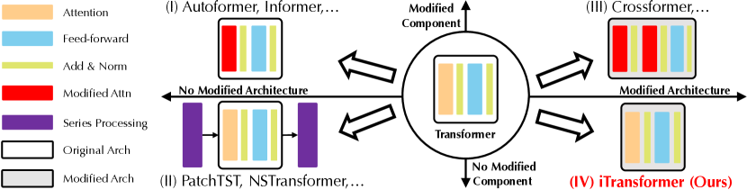 그림 3: 구성 요소 및 아키텍처 수정에 따라 분류된 Transformer 기반 예측기.
