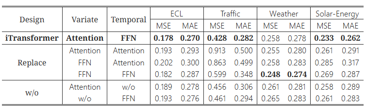 결론적으로, 변수 차원에서의 Attention과 시간 차원에서의 FFN을 사용하는 iTransformer의 설계가 모든 실험에서 가장 좋은 성능을 보였으며, 이는 Transformer의 구성 요소들을 올바르게 사용하는 것이 시계열 예측 성능에 매우 중요하다는 점을 강력히 뒷받침합니다.