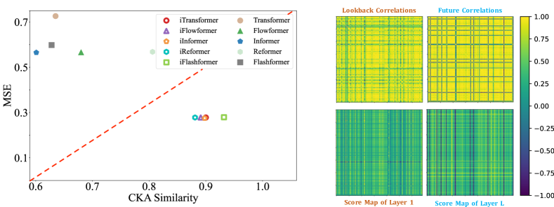 왼쪽: Transformer와 iTransformer 간의 시계열 표현의 MSE 및 CKA 유사성 비교. 더 높은 CKA 유사성은 더 정확한 예측을 위한 더 적합한 표현을 나타냅니다.