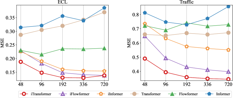 이전 연구에서는 Transformer에서 과거 관찰 길이(lookback length)가 증가해도 예측 성능이 반드시 향상되지 않는 현상을 목격했습니다(Nie et al., 2023; Zeng et al., 2023). 이는 입력이 증가하면서 주의(attention)가 분산되기 때문일 수 있습니다. 반면, 선형 예측에서는 일반적으로 과거 정보가 커짐에 따라 예측 성능이 향상되는 경향이 있으며, 이는 통계적 방법(Box & Jenkins, 1968)에 의해 이론적으로도 뒷받침됩니다. 주의 메커니즘과 피드포워드 네트워크의 작동 차원이 반전됨에 따라, 우리는 그림 6에서 과거 관찰 길이가 증가함에 따른 Transformer와 iTransformer의 성능을 평가했습니다. 결과는 놀랍게도 MLP를 시간 차원에서 활용하는 것이 합리적임을 검증하였으며, 이를 통해 Transformer가 확장된 과거 창을 활용해 더 정밀한 예측을 할 수 있다는 것을 확인했습니다.