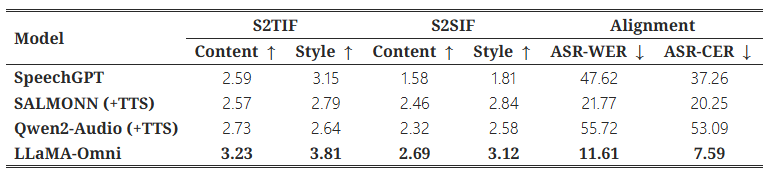 S2SIF 작업에서도 LLaMA-Omni는 콘텐츠와 스타일 점수에서 모두 이전 모델들을 능가한다. 이는 LLaMA-Omni가 사용자 명령을 음성으로 간결하고 효율적으로 처리할 수 있음을 다시 한 번 확인시켜 준다.