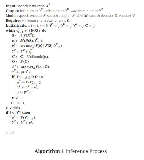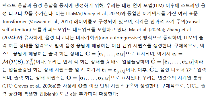 모델 구성 (Model Configuration) Whisper-large-v3의 인코더를 음성 인코더로 사용하고, Llama-3.1-8B-Instruct를 LLM으로 사용하였다. 음성 어댑터는 음성 표현을 5배 다운샘플링한다. 음성 디코더는 LLaMA와 동일한 아키텍처를 가진 2개의 Transformer 레이어로 구성되며, 히든 차원은 4096, 어텐션 헤드는 32개, 피드포워드 네트워크 차원은 11008로, 총 425M개의 파라미터를 가진다. 업샘플링 비율 λ는 25로 설정하였다. 보코더에 입력되는 최소 단위 청크 크기 Ω는 주 실험에서 Ω=+∞로 설정하여, 전체 단위 시퀀스가 생성된 후 보코더에 입력해 음성을 합성하도록 하였다. 이후 실험에서는 Ω값을 조정하여 응답 지연 시간과 지연 및 음성 품질 간의 절충점을 분석할 예정이다.
