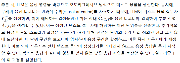 대형 언어 모델(LLMs), 예를 들어 ChatGPT(OpenAI, 2022)는 강력한 범용 작업 해결사가 되어 대화형 상호작용을 통해 사람들을 일상생활에서 돕고 있다. 그러나 현재 대부분의 LLM은 텍스트 기반 상호작용만 지원하기 때문에 텍스트 입력과 출력을 사용하는 것이 이상적이지 않은 상황에서 그 적용이 제한된다. 최근 등장한 GPT-4o(OpenAI, 2024)는 음성을 통해 LLM과 상호작용할 수 있게 만들어 매우 낮은 지연 시간으로 사용자의 지시에 응답하며 사용자 경험을 크게 향상시켰다. 그러나 오픈 소스 커뮤니티에서는 이러한 음성 상호작용 모델을 LLM 기반으로 구축하는 것에 대한 탐구가 여전히 부족하다. 따라서 LLM과의 저지연, 고품질 음성 상호작용을 어떻게 실현할 것인가는 해결해야 할 시급한 과제이다.