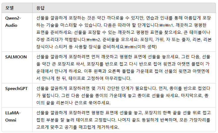 표 4에서 다양한 모델이 "선물을 깔끔하게 포장하는 방법"에 대해 어떻게 응답하는지 살펴볼 수 있다. Qwen2-Audio의 응답은 상당히 길고, 줄 바꿈과 괄호와 같은 음성으로 합성하기 어려운 요소들을 포함하고 있다. SALMOON의 응답도 다소 긴 편이다. SpeechGPT의 응답은 음성 상호작용 시나리오에 더 적합한 스타일이지만, 포함된 정보의 양이 적다. 반면, LLaMA-Omni의 응답은 간결한 스타일을 유지하면서도 보다 상세하고 유용하여, 음성 상호작용 시나리오에서 이전 모델들보다 뛰어난 성능을 보인다.