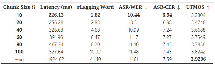 표 2: 다양한 단위 청크 크기에서 지연 시간, 음성-텍스트 정렬 및 음성 품질