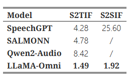- LLaMA-Omni는 S2TIF 작업에서 콘텐츠와 스타일 모두에서 가장 높은 점수를 기록하였다. 이는 최신 Llama-3.1-8B-Instruct 모델을 기반으로 강력한 명령 수행 능력을 잘 활용했으며, 스타일 측면에서도 매우 자연스러운 음성 상호작용을 반영했음을 보여준다.