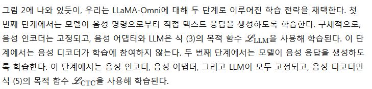 학습 (Training) LLaMA-Omni는 두 단계의 학습 과정을 따른다. 첫 번째 단계에서는 배치 크기 32로 음성 어댑터와 LLM을 3 에폭 동안 학습한다. 첫 3% 단계는 워밍업으로 사용하고, 코사인 학습률 스케줄러를 사용하며, 최고 학습률은 2e−5로 설정하였다. 두 번째 단계에서는 동일한 배치 크기, 단계 수, 학습률 스케줄러를 사용하지만, 최고 학습률은 2e−4로 설정하여 음성 디코더를 학습한다. 전체 학습 과정은 4개의 NVIDIA L40 GPU에서 약 65시간이 소요되었다.