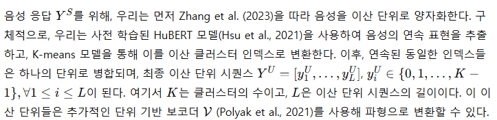SpeechGPT SpeechGPT (Zhang et al., 2023)는 음성 입력과 출력을 모두 지원하는 음성-언어 모델이다. 우리는 원 논문에서 채택한 모달리티 체인 프롬프트(chain-of-modality prompting)를 디코딩에 사용하여, 음성 명령에 기반해 텍스트 명령, 텍스트 응답, 음성 응답을 순차적으로 출력한다.