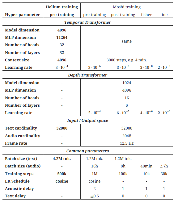 표 1: 모델의 하이퍼파라미터. Helium 언어 모델(70억 개의 파라미터)과 Moshi 음성-텍스트 대화 모델의 아키텍처와 학습 하이퍼파라미터입니다. Moshi의 학습은 다음 네 가지 단계로 진행됩니다: 1) 비지도 데이터로의 사전 학습(Helium에서 초기화된 Temporal Transformer 사용), 2) 다이어리제이션 기반의 시뮬레이션된 다중 스트림을 이용한 후속 학습, 3) Fisher 데이터셋(Cieri et al., 2004)으로 풀 듀플렉스 기능을 습득하기 위한 미세 조정, 4) 합성 상호작용 스크립트로 만든 커스텀 데이터셋을 사용한 명령어 미세 조정. 사전 학습 단계에서 Helium에 사용된 동일한 데이터셋에서 전체 텍스트 배치를 학습하는 시간을 절반으로 유지하며, 별도의 옵티마이저 상태를 사용합니다.