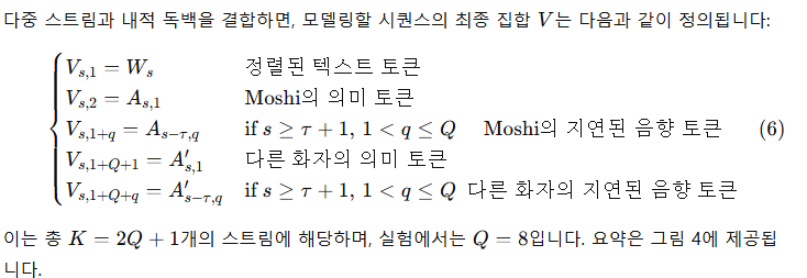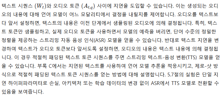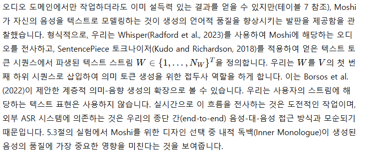 - 내적 독백(Inner Monologue)을 도입합니다. 오디오 언어 모델의 학습과 추론 설정으로, 오디오 토큰 예측 전에 시간 정렬된 텍스트 토큰을 예측함으로써 생성된 음성의 사실성과 언어적 품질을 크게 향상시킵니다. Moshi는 사용자 오디오와 Moshi의 오디오 모두에서 비언어적 정보를 추론할 수 있는 음성-대-음성 모델이지만, 이는 Moshi가 음성을 출력할 때 텍스트를 생성하는 것과 양립할 수 있습니다. 과거 연구(Borsos et al., 2022; Zhang et al., 2024b)에 따르면 의미에서 음향 토큰으로의 생성 과정이 일관된 음성을 생성하는 데 중요하다는 점을 감안하여, 이 계층을 텍스트 토큰을 의미적 토큰의 시간 단계별 접두사로 사용하도록 확장했습니다. 실험 결과, 이 접근 방식이 생성된 음성의 길이와 품질을 크게 향상시키며, 텍스트와 오디오 토큰 사이의 지연을 강제하여 Moshi 모델로부터 스트리밍 ASR 및 스트리밍 TTS를 도출할 수 있음을 보여줍니다.