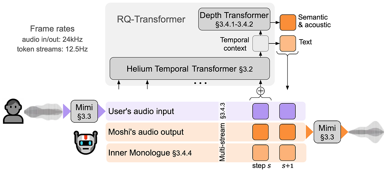 Moshi는 다중 스트림 음성-대-음성 트랜스포머 모델로, 그림 1에 요약된 혁신적인 아키텍처 덕분에 사용자와의 풀-듀플렉스 음성 대화를 가능하게 합니다. Moshi는 Helium을 기반으로 구축되었으며, 이는 우리가 처음부터 고품질의 텍스트 데이터를 사용하여 강력한 추론 능력을 제공하도록 설계한 텍스트 LLM입니다(3.2절 참조). 또한, Inner Monologue(3.4.4절 참조)라는 훈련 및 추론 절차를 제안하여 텍스트와 오디오 토큰을 공동으로 모델링합니다. 이를 통해 모델이 텍스트 모달리티에서 전달받은 지식을 최대한 활용하면서도 음성-대-음성 시스템으로 유지될 수 있습니다. 실시간 대화를 가능하게 하기 위해 Moshi는 처음부터 다중 스트림 아키텍처로 설계되었습니다(3.4.3절 참조). 이 모델은 사용자와 동시에 말하고 들을 수 있으며, 화자의 턴을 명시적으로 모델링할 필요가 없습니다. 또한, 사용자 오디오 입력과 Moshi의 음성 출력을 고품질로 효율적으로 캡처하기 위해, 우리는 잔여 벡터 양자화와 지식 증류를 사용해 의미적 정보와 음향 정보를 하나의 토크나이저로 결합한 신경 오디오 코덱인 Mimi(3.3절 참조)를 제안합니다. Moshi와 사용자의 오디오 스트림, 그리고 Moshi의 텍스트 토큰을 공동으로 모델링하기 위해, 스트리밍 추론과 호환되는 Depth Transformer를 사용합니다(3.4.1, 3.4.2절).