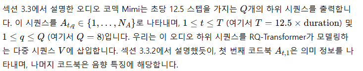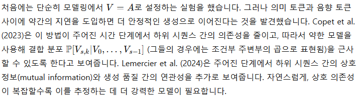 음성 언어를 모델링할 때, 토큰화된 텍스트를 사용하는 것은 오디오 토큰보다 훨씬 더 압축된 표현을 제공합니다. 섹션 3.3에서 소개한 Mimi 코덱을 사용할 경우, 프레임 속도 12.5Hz에서 코드북 수 Q=8을 가질 때, 오디오 1초를 생성하기 위해 100단계의 시퀀스 길이가 필요합니다. 5분의 오디오를 모델링하려면 30,000개의 시간 단계가 필요하며, 이는 상당한 계산 비용을 초래하며 초당 100개의 토큰을 생성하는 것은 스트리밍 추론과 호환되지 않습니다. 이에 비해 영어 음성 샘플은 초당 약 3~4개의 텍스트 토큰으로 표현될 수 있습니다.