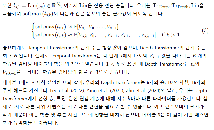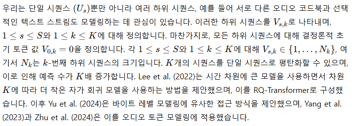 RQ-Transformers를 사용해 오디오를 모델링하는 것은 Yang et al. (2023)과 Zhu et al. (2024)에서도 성공적으로 사용된 바 있습니다. 우리는 여기서 Depth Transformer에 코드북별 매개변수를 사용하는 것과 음향 지연을 도입했습니다. Zhu et al. (2024)에서는 모든 의미 토큰을 먼저 생성한 반면, 우리는 의미 토큰과 음향 토큰을 동시에 생성하여 처음으로 의미와 음향 토큰을 스트리밍 방식으로 공동 모델링할 수 있게 했습니다.