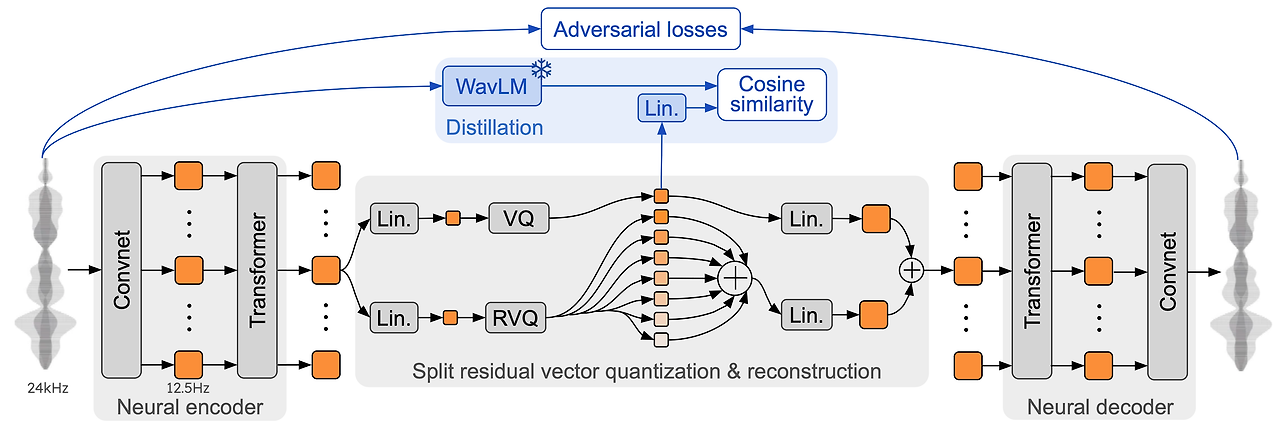 그림 2: 우리의 신경 오디오 코덱 Mimi의 아키텍처와 학습 과정, 그리고 분할 잔여 벡터 양자화. 학습 중(파란 부분, 상단), 우리는 WavLM(Chen et al., 2022)으로부터 비인과적 임베딩을 하나의 벡터 양자화기로 증류하여 의미 토큰을 생성하고, 이는 별도의 음향 토큰과 결합되어 재구성을 수행합니다.
