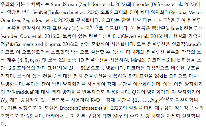 파형을 오디오 토큰으로 이산화하기 위해, 우리는 Mimi라는 신경 오디오 코덱(Zeghidour et al., 2022; Défossez et al., 2023)을 도입합니다. Mimi는 이산 병목을 가진 오토인코더로 작동합니다(van den Oord et al., 2017). 문헌에서는 Borsos et al. (2022)이 정의한 용어를 따르며, 이러한 토큰을 '음향 토큰(acoustic tokens)'이라 부르는데, 이는 세밀한 오디오 세부 사항을 모델링하며 고품질의 재구성을 위해 최적화된 토큰입니다. 이 음향 토큰은 텍스트-오디오 모델(e.g., 텍스트-음성(Wang et al., 2023) 또는 텍스트-음악(Copet et al., 2023))에 적합한 타겟을 제공하지만, 비조건 음성 생성을 위해서는 자가 지도 학습 음성 모델(Baevski et al., 2020; Hsu et al., 2021; Chung et al., 2021)에서 추출한 의미 토큰과 결합해야 합니다. 음향 토큰과 달리 의미 토큰은 고품질 오디오를 재구성할 수 없지만, 언어적 콘텐츠와 강하게 상관관계가 있습니다. 이러한 언어와의 유사성 덕분에 의미 오디오 토큰을 음향 토큰 예측의 접두사로 사용하면 텍스트 조건 없이도 이해 가능하고 일관된 음성을 생성할 수 있습니다. 그러나 이러한 하이브리드 토큰화 접근법은 실시간 생성과는 호환되지 않습니다. 의미 토큰은 일반적으로 인과적이지 않아 오프라인 방식에서만 계산이 가능합니다. 또한, 별도의 인코더를 사용해 음향 및 의미 토큰을 생성하는 것은 무시할 수 없는 계산 부담을 초래합니다. 따라서, 이전의 SpeechTokenizer 연구(Zhang et al., 2024b)에서 영감을 받아, Mimi는 비인과적 고수준 의미 정보를 인과적 모델이 생성한 토큰으로 증류하여 의미-음향 토큰의 스트리밍 인코딩 및 디코딩을 가능하게 합니다.