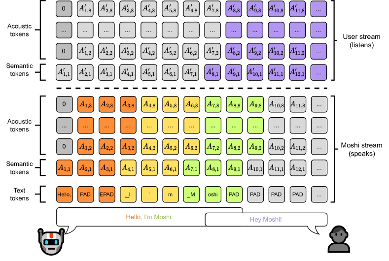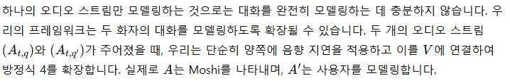 이제 우리는 Helium 모델을 확장하여 Mimi 코덱이 제공하는 오디오 토큰을 모델링하는 방법을 설명합니다. 현실감 있는 음성 대화 상호작용을 달성하기 위한 목표로, 단일 오디오 스트림뿐만 아니라 사용자와 시스템을 동시에 나타내는 두 개의 스트림을 어떻게 모델링할 수 있는지도 보여줍니다. 마지막으로, 상호작용의 품질을 개선하기 위해 시스템 측에서 텍스트와 오디오 모달리티를 공동으로 모델링하는 '내적 독백(Inner Monologue)'이라는 새로운 기능을 상세히 설명합니다.