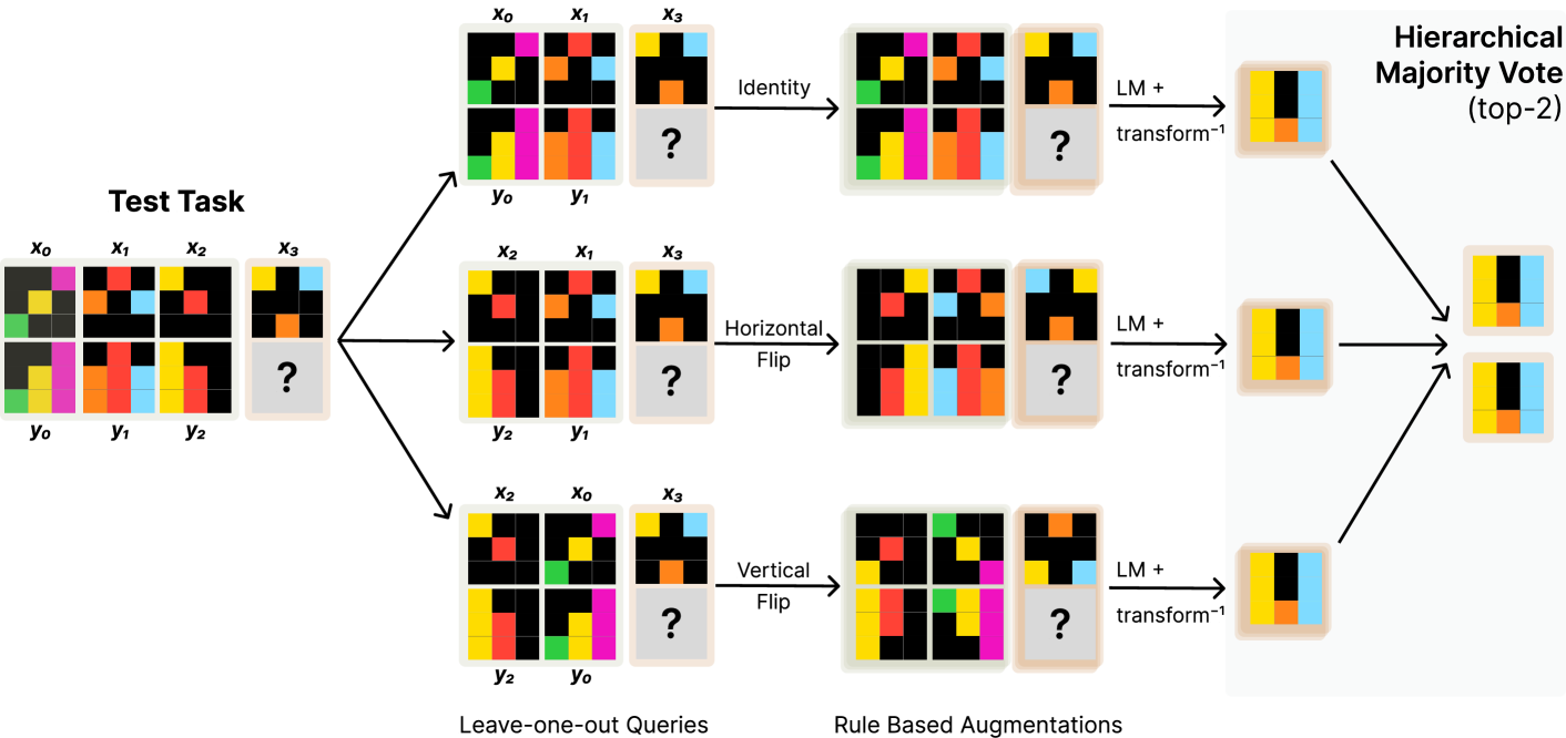 Figure 4: 증강 추론 및 계층적 투표 (섹션 4): 우리는 leave-one-out 작업과 가역적인 기하학적 변환을 사용하여 증강된 추론을 위해 작업의 여러 동등한 버전을 얻습니다. 이러한 버전들의 예측은 계층적 투표 전략을 통해 집계됩니다: 먼저 각 변환 내에서 투표가 수행되고, 그런 다음 각 변환에서의 상위 후보들이 글로벌 투표를 통해 최종 상위 두 개의 예측으로 결정됩니다.