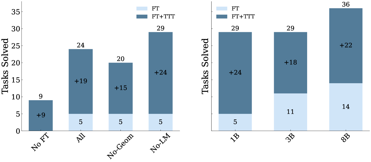 모델 크기와 TTT에서의 스케일링 그림 7에서 서로 다른 모델 크기를 사용한 결과를 보여줍니다. 모델 크기가 증가할수록 FT 성능이 일관되게 향상되며, 80억 모델이 36%의 최고 정확도를 달성했습니다. 또한, TTT가 작은 모델들의 성능 격차를 효과적으로 줄여줌을 관찰했으며, 10억과 30억 모델은 TTT 이후 유사한 정확도를 달성했습니다.