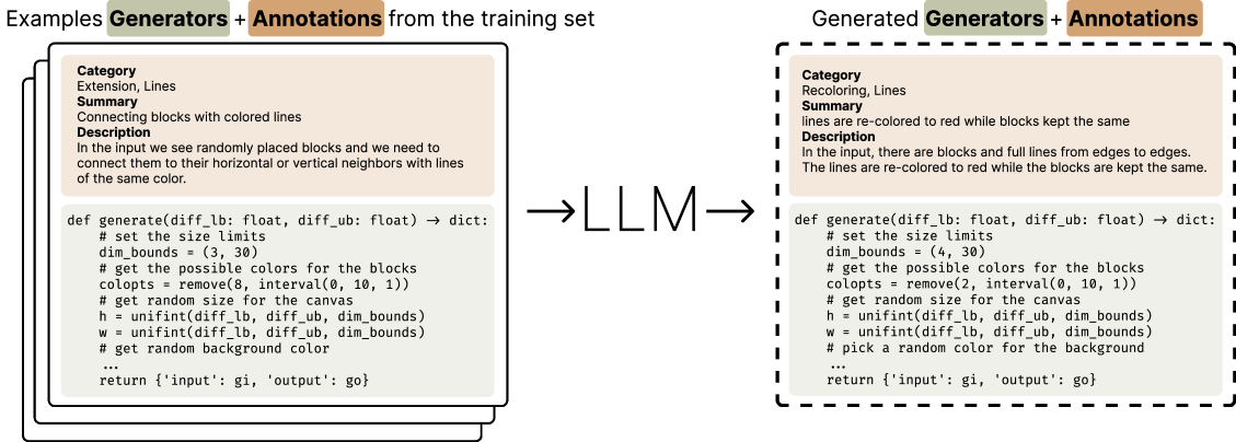 (a) 기존 생성기 사용 ReARC의 생성 함수 g 들은 이미 동일한 작업의 다른 형태를 생성함으로써 효과적인 데이터 증강 도구를 제공합니다. 우리는 이러한 학습 작업에서 많은 횟수로 코드를 실행하여 추가 샘플을 생성하고, 이러한 새로운 예제들( d ∼ eval(g_i) )을 무작위로 학습 및 테스트 예제 집합으로 나눕니다. 이러한 증강 예제들은 이미 DSL 릴리스와 함께 제공됩니다.