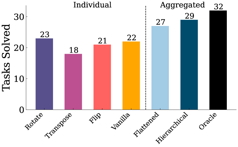 Figure 5: 다양한 가역적 변환과 투표 방식의 정확도: 우리의 분석 결과, 개별 변환은 일반적으로 보통 수준의 성능을 보이며 서로 비교적 유사하지만, 이들을 투표를 통해 집계하면 상당한 개선이 이루어진다는 것을 알 수 있습니다. 특히, 두 단계의 투표를 포함한 계층적 투표 전략이 평면적 투표 방식보다 우수한 성능을 발휘합니다. 우리의 계층적 방법은 오라클 수준의 성능에 근접하며, 정확한 답이 있을 때 이를 정확히 선택하는 효과성을 입증합니다. 전체 논의는 섹션 4.3에 있습니다.