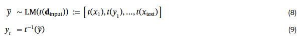 ŷ_{n+1} ∼ LM(⋅ ∣ x_1, y_1, ..., x_n, y_n, x_{n+1}) ] (1)